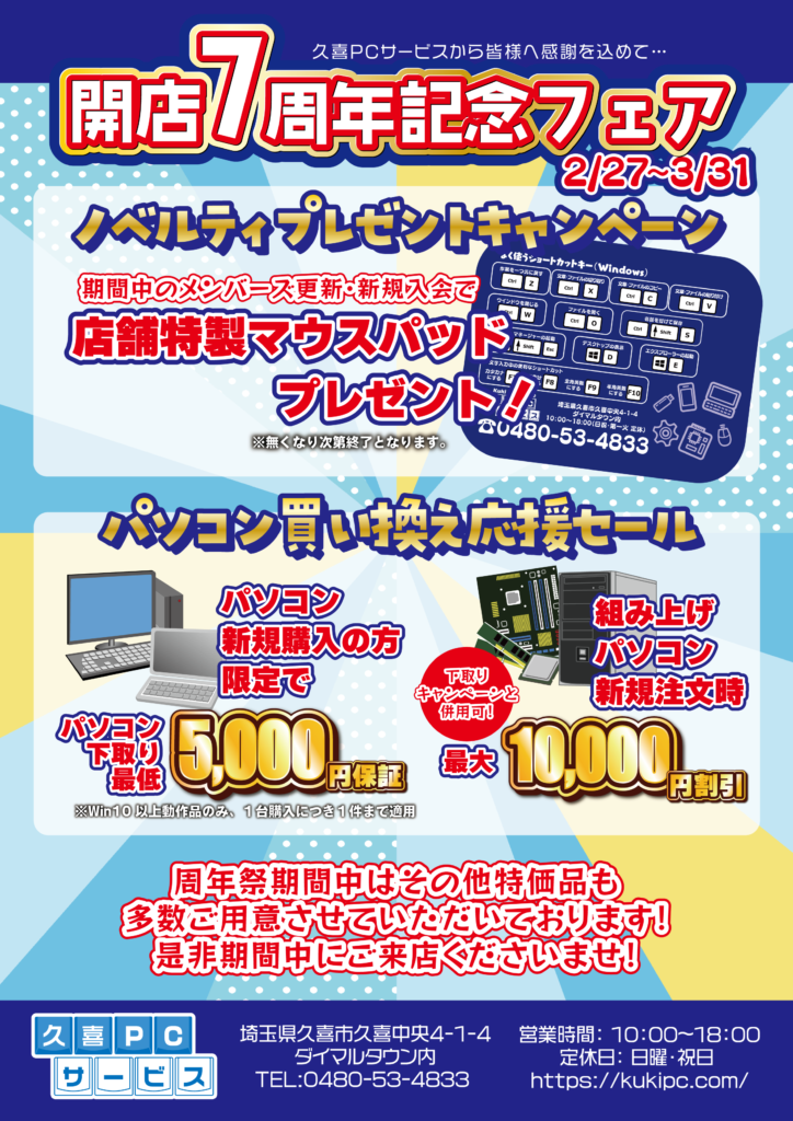 2025年12月5日 / 最終更新日時 : 2025年12月5日 kuki_staff ブログ 【歳末大感謝祭】1年間のご愛顧に感謝して、年内最終営業日まで特別キャンペーン実施中! こんにちは、スタッフの荒木です。 久喜PC サービスでは日頃のご愛顧に感謝を込めて、 年内最終営業日までのお得な「歳末大感謝祭」キャンペーンを開催しています。 🎁 特典その1 PC新規購入で 下取り最低 5,000円保証 […]